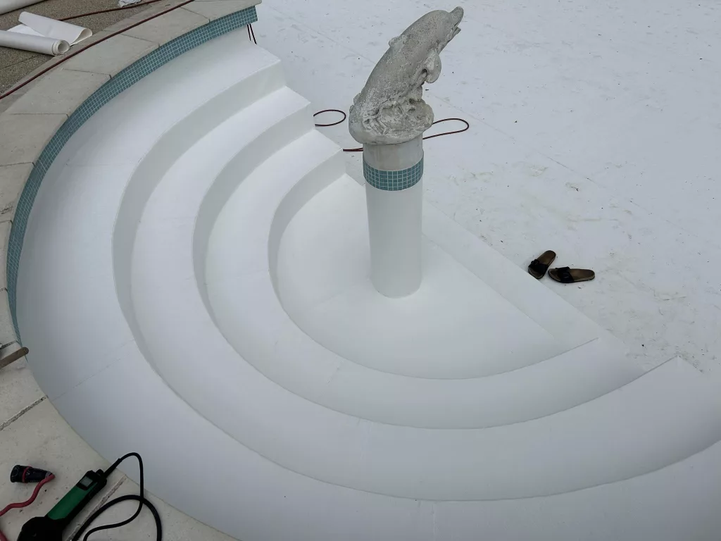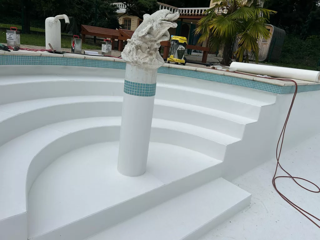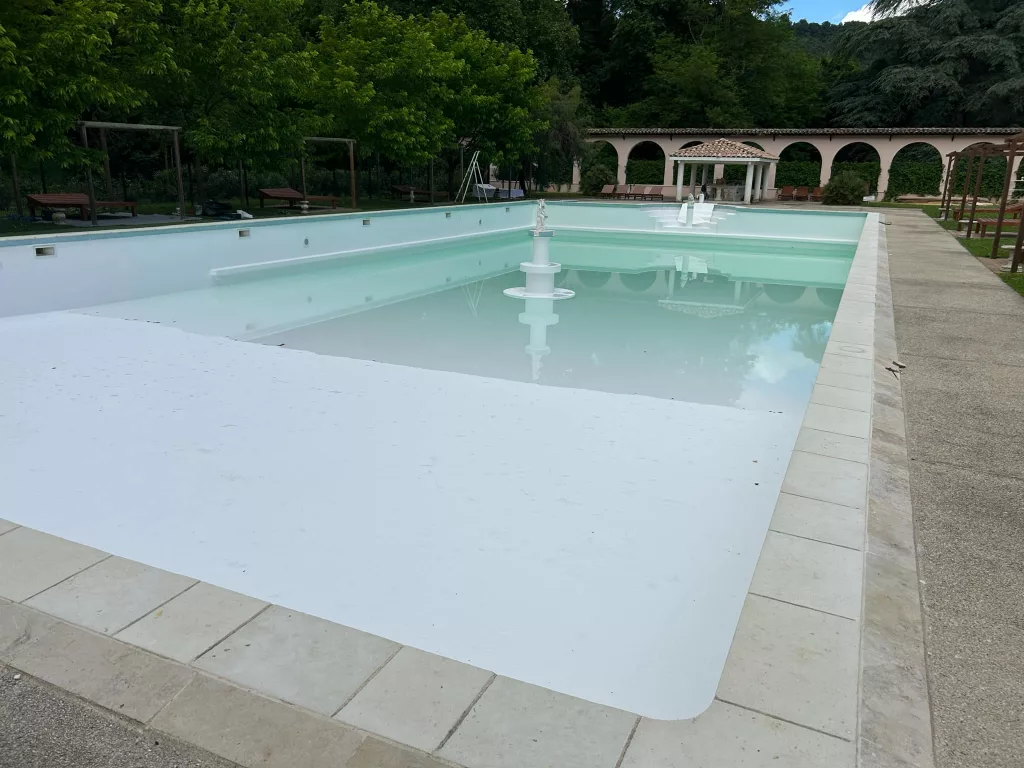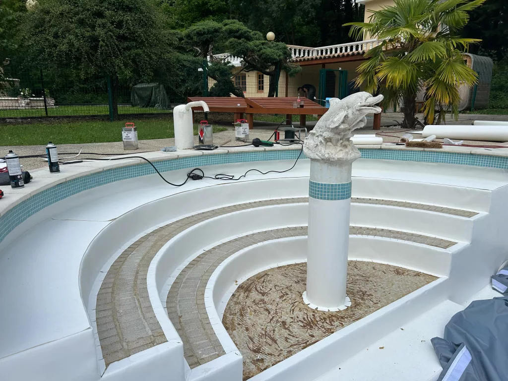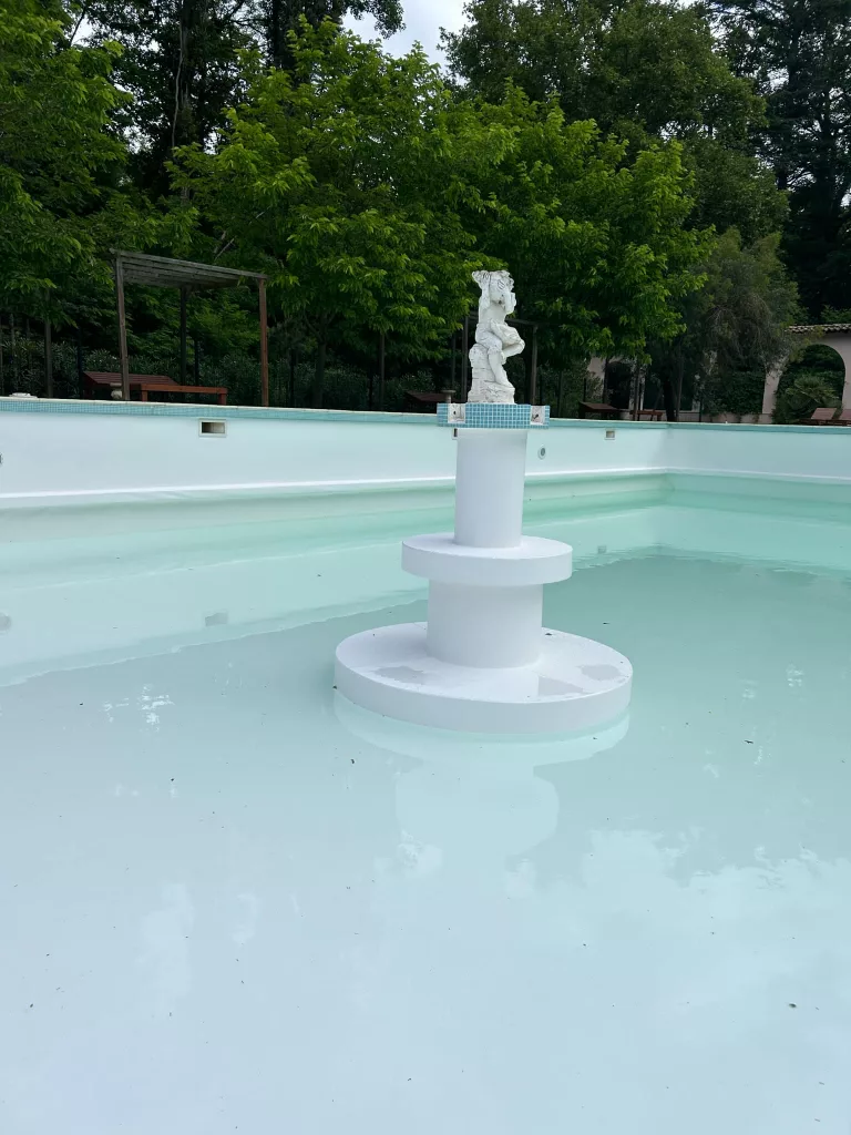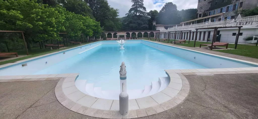 Voici notre réalisation en membrane piscine Aquacolor blanc pour un bassin d’exception de 32 mètres par 17 mètres, intégrant un design élégant et fonctionnel. Ce bassin dispose de deux escaliers romains situés de chaque côté, chacun agrémenté de fontaines intégrées pour un effet visuel et sonore apaisant. Au centre du bassin, le magnifique château de Fontager s’élève, ajoutant une touche majestueuse. Le fond du bassin présente une pente douce allant de 1 mètre à 2 mètres, idéale pour une baignade agréable et progressive. Cette piscine allie esthétisme, confort et durabilité, parfaite pour les amateurs de luxe et d’élégance.